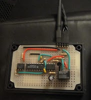 The microcontroller is on the back of the circuit board, and I used a multimeter and the microcontroller's datasheet to figure out what pins were 5V, ground, and the power switch. I drilled a small hole next to where the cable comes out to run these 3 new wires out to my circuit.